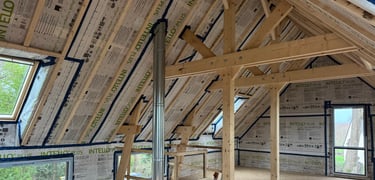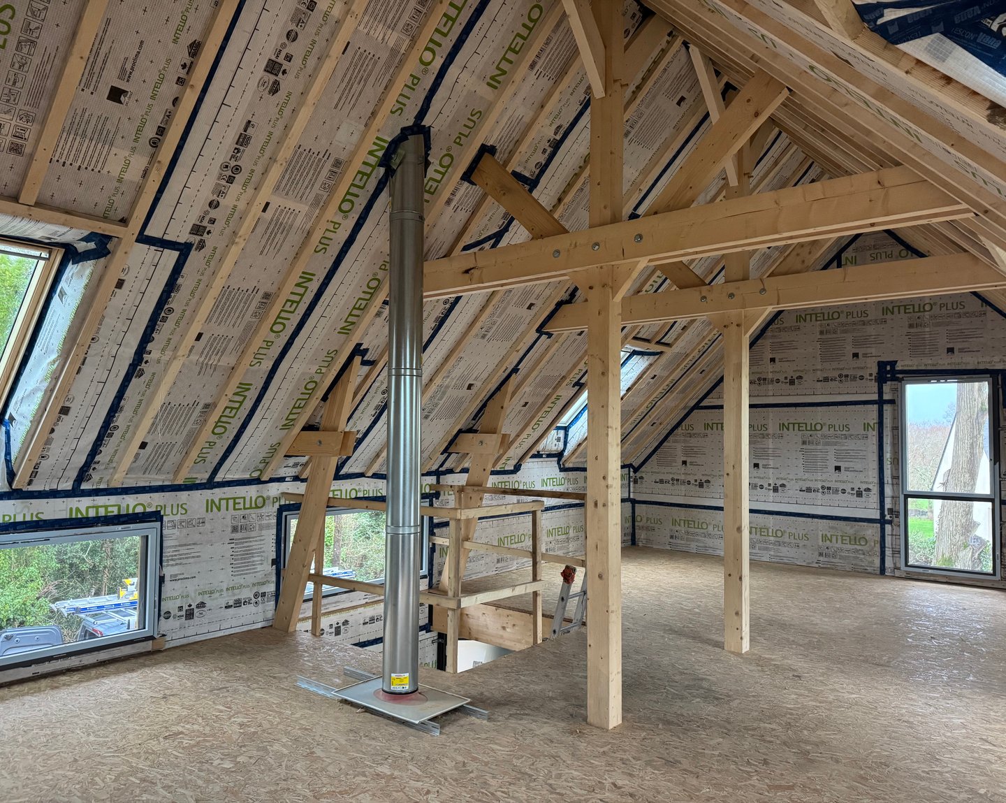 Chantier en cours, deux fermes traditionnelles à entraits retroussés, blochets et jambes de force soutiennent la charpente. Une isolation performante en laine de bois, une épaisseur de 220 mm dans la chambrée des pannes + 60 mm entre chevrons permet d'atteindre la RE2020 et d'assurer un excellent confort thermique été comme hiver.