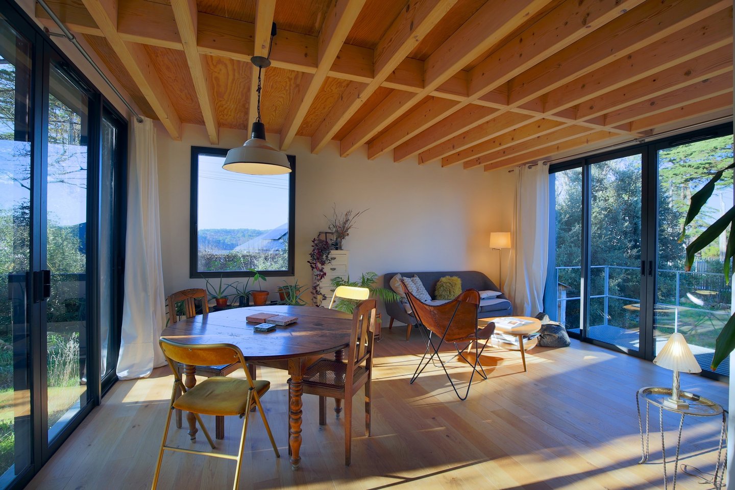 Ossature bois, isolation laine de bois, récupération d'eau de pluie et chauffage poêle à buches